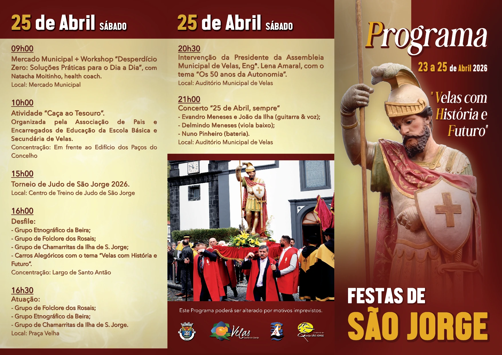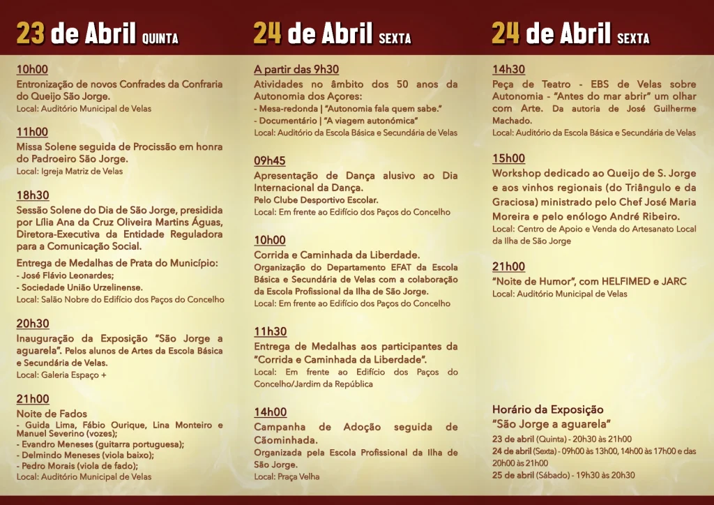 Conheça o Programa das Festas de São Jorge, que se realizam de 23 a 25 de abril, este ano com o tema “Velas com História e Futuro”. PROGRAMA DAS FESTAS DE SÃO JORGE 2026